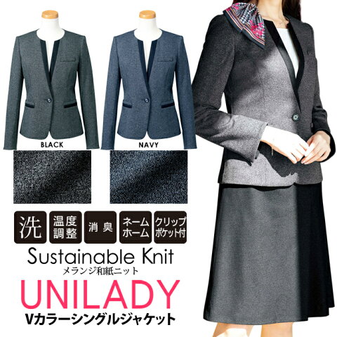【スーツ/シングルVカラージャケット*オールシーズン対応】家庭洗濯機で洗える/ブラック/ネイビー/リクルートスーツユニレディ/ビジネス/オフィス/事務服/スーツ/湿度調整/消臭/受付服/和紙ニット/ストレッチ生地/ノーアイロン/unilady/レディース/ヤギYAGIU2024